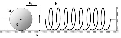 Ο ομογενής κύλινδρος του σχήματος έχει μάζα m = 8 kg, ακτίνα R και κυλίεται χωρίς να ολισθαίνει στο οριζόντιο επίπεδο έτσι ώστε ο άξονάς του να είναι κάθετος στον άξονα του ελατηρίου. Ο άξονας του ελατηρίου διέρχεται από το κέντρο μάζας του κυλίνδρου, το οποίο μετατοπίζεται με ταχύτητα υο προς το ελεύθερο άκρο του ελατηρίου. Το ελατήριο είναι ιδανικό, σταθεράς k = 300 N/m και είναι στερεωμένο στο άλλο του άκρο. Ο συντελεστής οριακής στατικής τριβής και τριβής ολίσθησης μεταξύ κυλίνδρου και δαπέδου είναι μ = 0,25. Θεωρούμε ακόμα ότι κατά την επαφή του κυλίνδρου με το άκρο του ελατηρίου δεν υπάρχει τριβή.